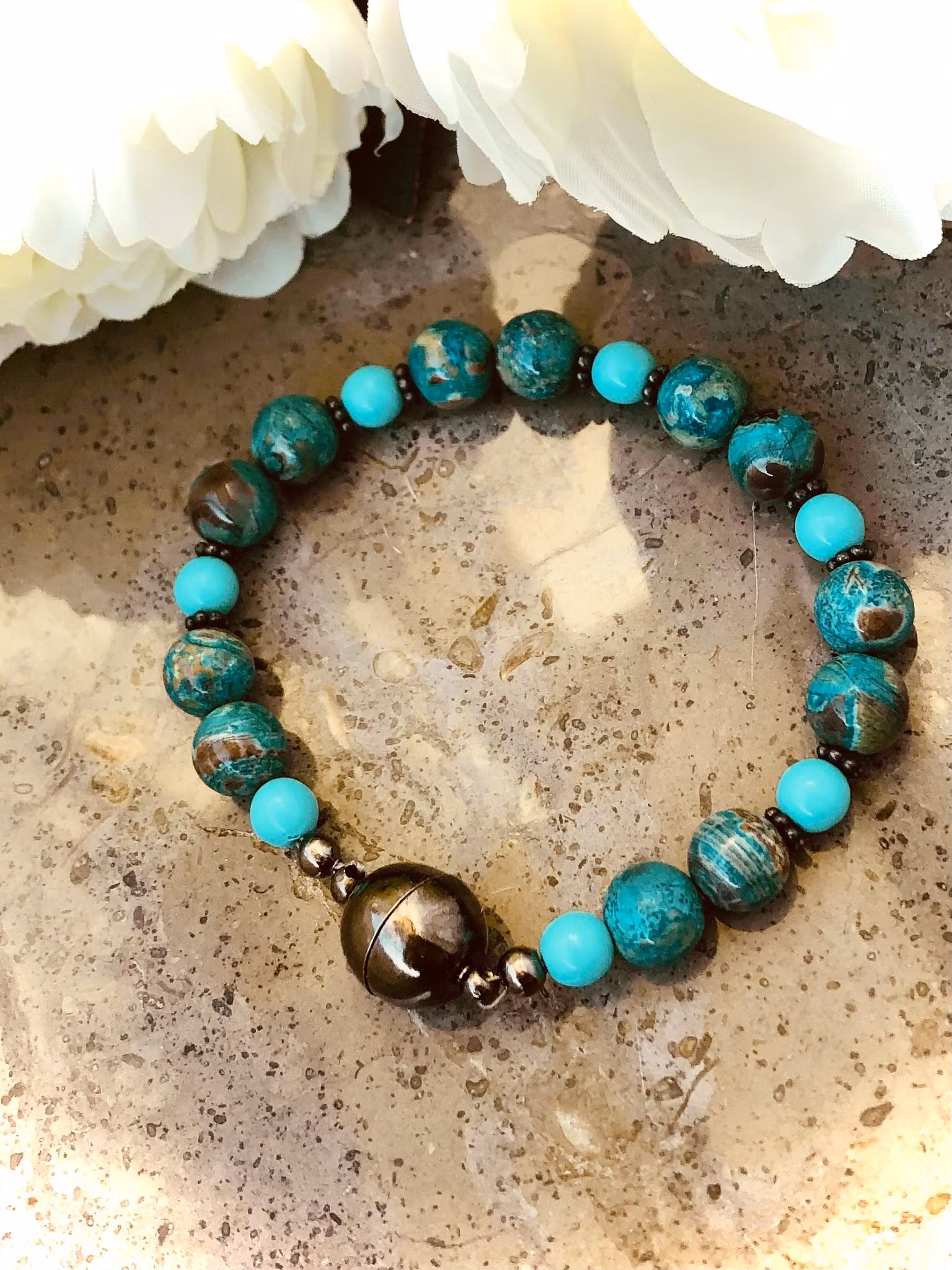 En mycket vacker marmorering och färg. Här kombinerad med genomfärgade turkosa pärlor av pressat glas.