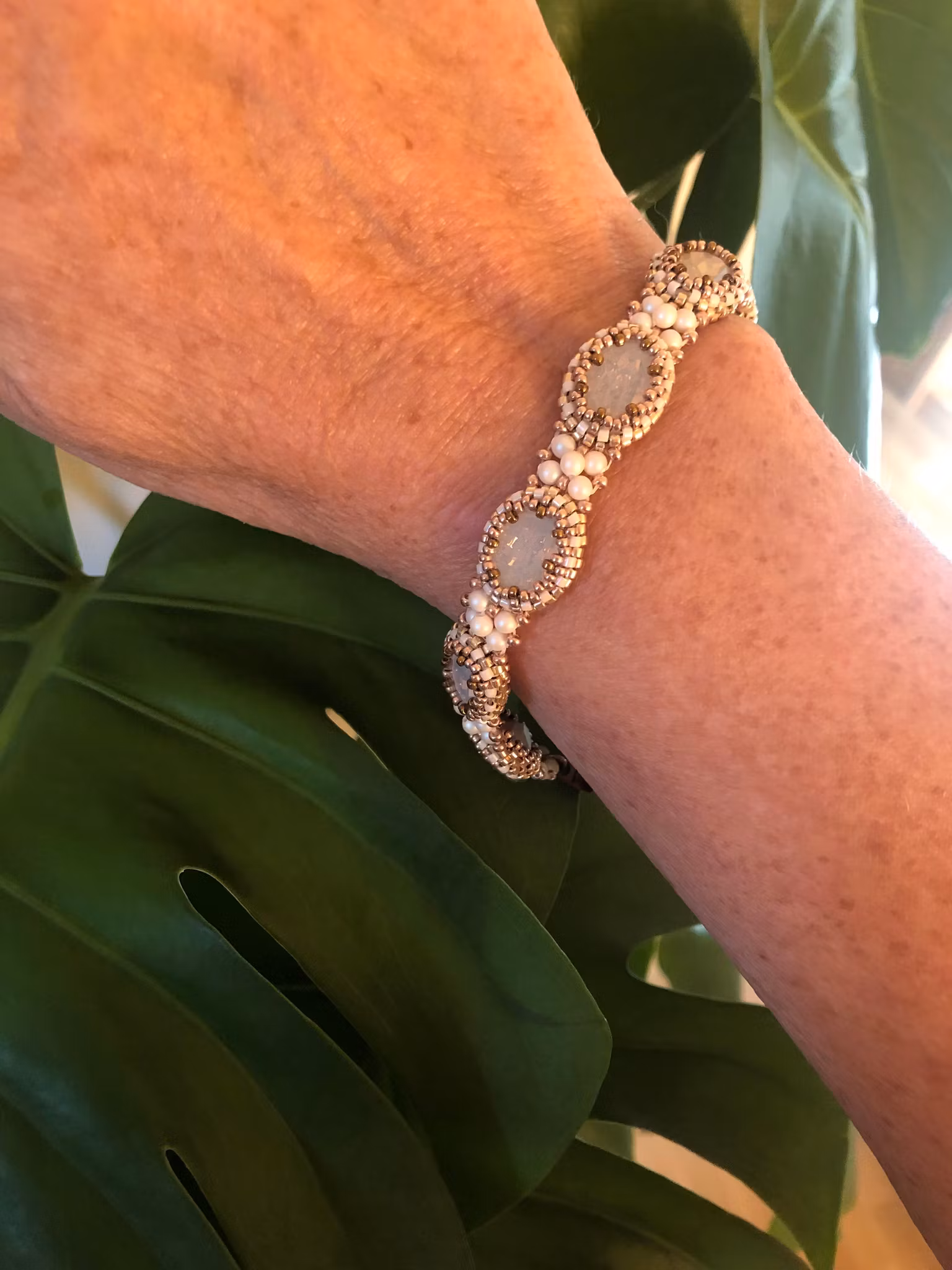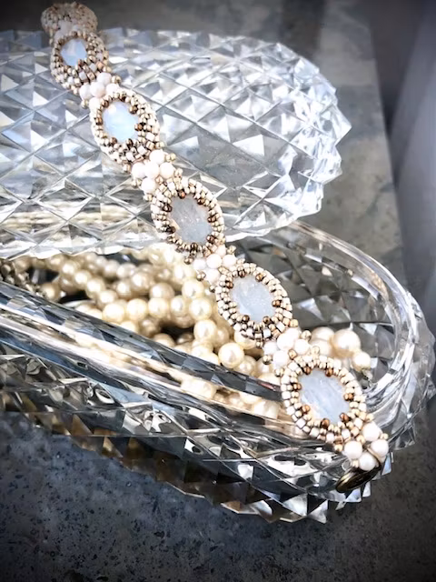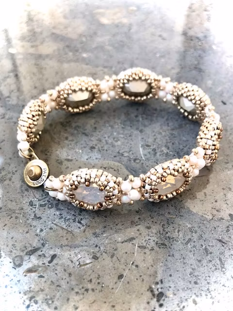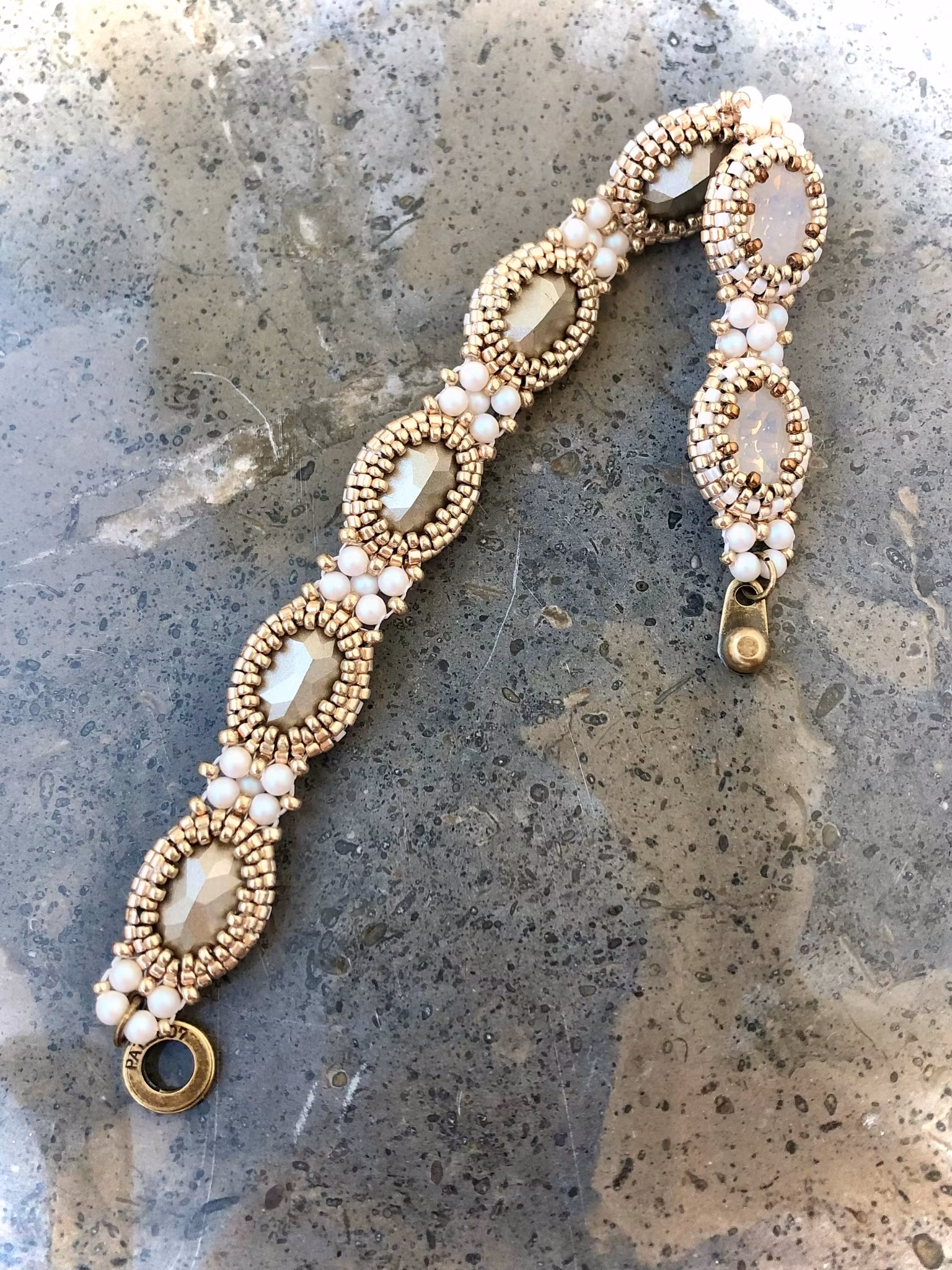 Tillverkat av Swarovski kristaller och swarovski pärlor. Knapplås i bronsfärg.