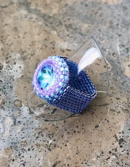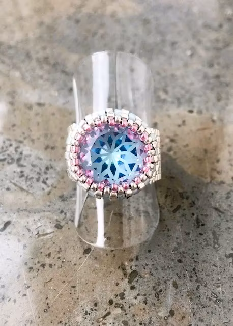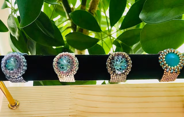 Ringarna består av en glaskristall eller matt skimrande turkos metall och galvaniserat glas i silver, tenn, brons eller glaspärlor i lilablå metallic.